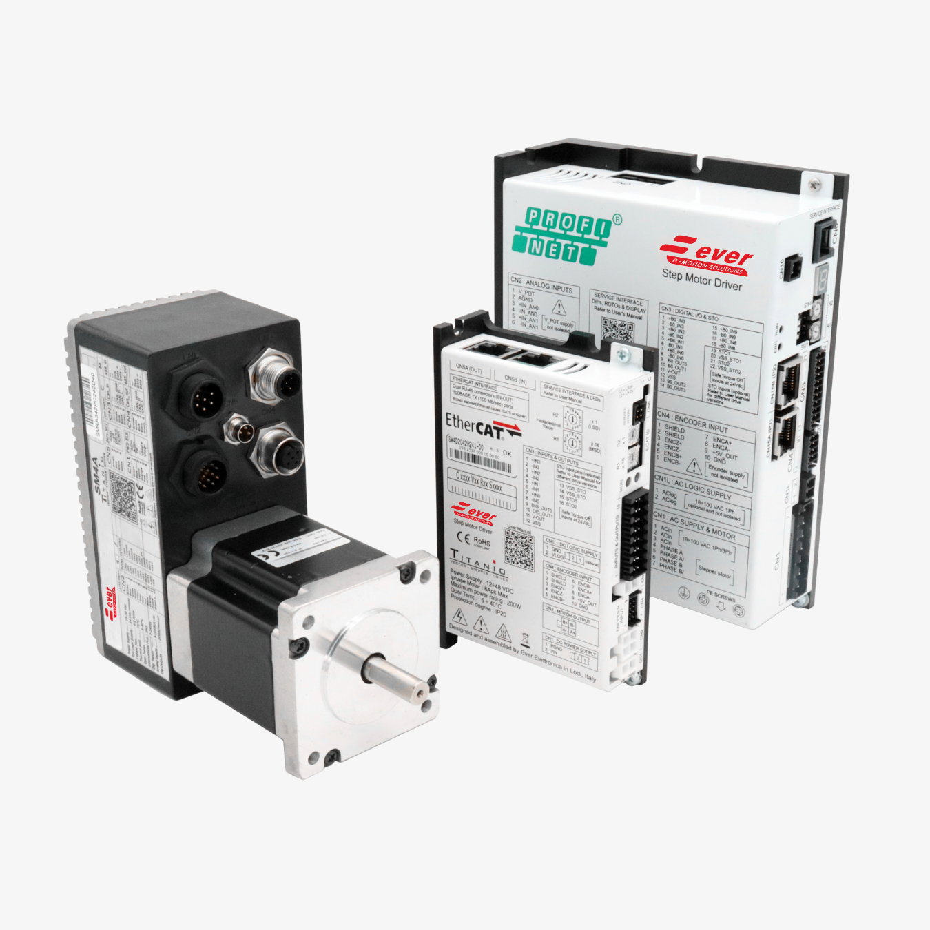 I driver Ever Motion Solutions sono progettati per lavorare in sinergia con i motori passo-passo ibridi a 2 e 3 fasi, disponibili in versioni standard, con encoder, freno e riduttore. L’ampia compatibilità con protocolli di comunicazione e la gestione avanzata del microstepping assicurano un controllo fluido anche nelle applicazioni più critiche. In combinazione con i driver programmabili o con bus di campo, questi motori raggiungono livelli di efficienza e precisione ideali per macchine CNC, sistemi di pick & place, automazione medicale e processi di confezionamento.